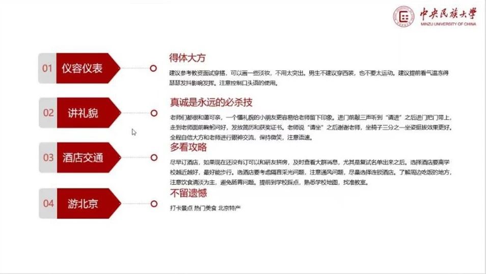 姜晋楠向同学们做了关于中央民族大学的考情介绍,分享了相关学科语文专业的复试流程,并详细介绍了同学们在面试时的应做的各项准备工作,包括穿着、礼仪、态度等方面,尤其强调面试时要保持良好的心态。她提到,复试期间要针对公司做好充分的攻略,密切关注官方消息。最后,姜晋楠鼓励同学们只要坚持下去,就会迎来未来的美好曙光。