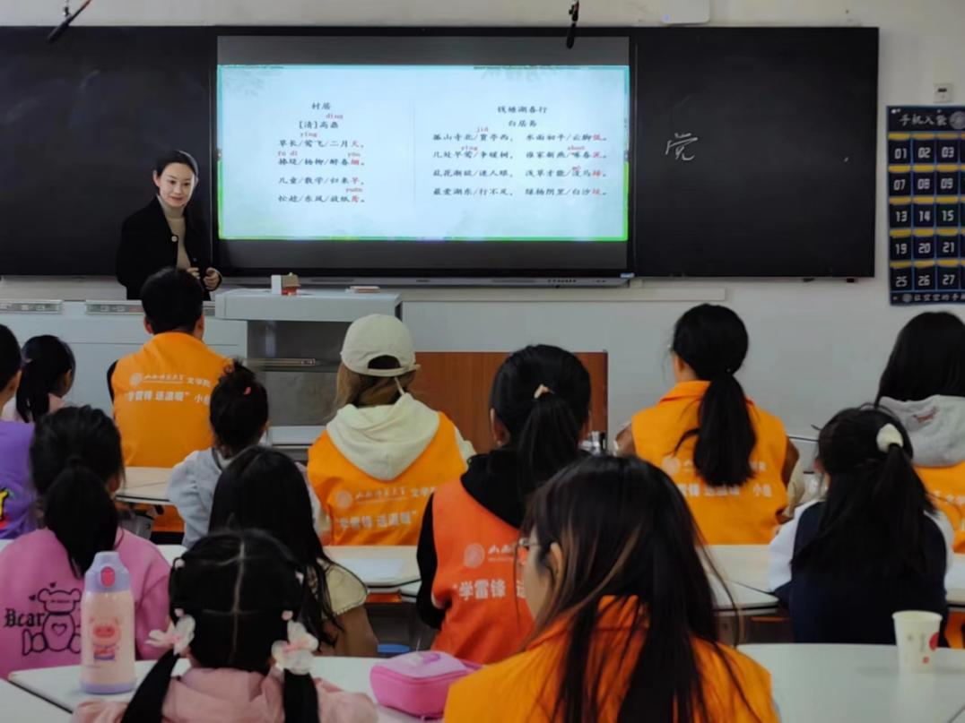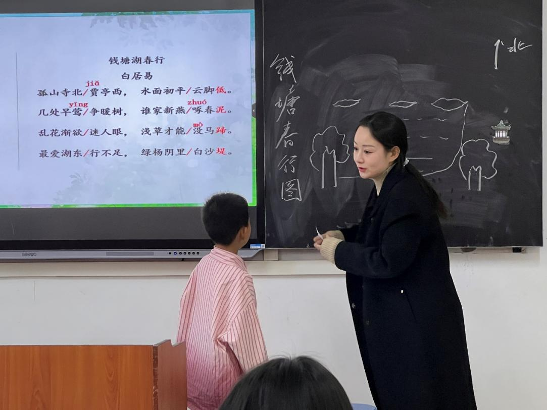 活动中,红烛文学社负责人2101班党子妍向小朋友们讲解了《村居》和《钱塘湖春行》这两首古诗,指出读诗要“读准确,有节奏,有味道”,并逐字逐句进行分析讲解,让小朋友们能够充分理解。随后她带领小朋友们一起绘制了“春日村居图”和“钱塘春行图”,在绘制两幅图时,党子妍设置了若干巧妙的问题进行提问,引导小朋友们说出自己的观点,并鼓励小朋友在黑板上自己动手画。小朋友们展现了自己丰富多彩的想法,并在课堂上积极互动。接着在志愿者的组织下,小朋友们一起朗读诗句,在充分理解诗歌的内容前提下熟记诗歌内容。在手绘风筝环节,小朋友们将课堂上学到的知识运用到实践中去。小朋友们充分发挥想象力和动手能力,用颜料为风筝涂色,用画笔绘出心中所想。活动最后,小朋友们带着自己的手绘风筝与志愿者们合影留念,活动圆满落下帷幕。