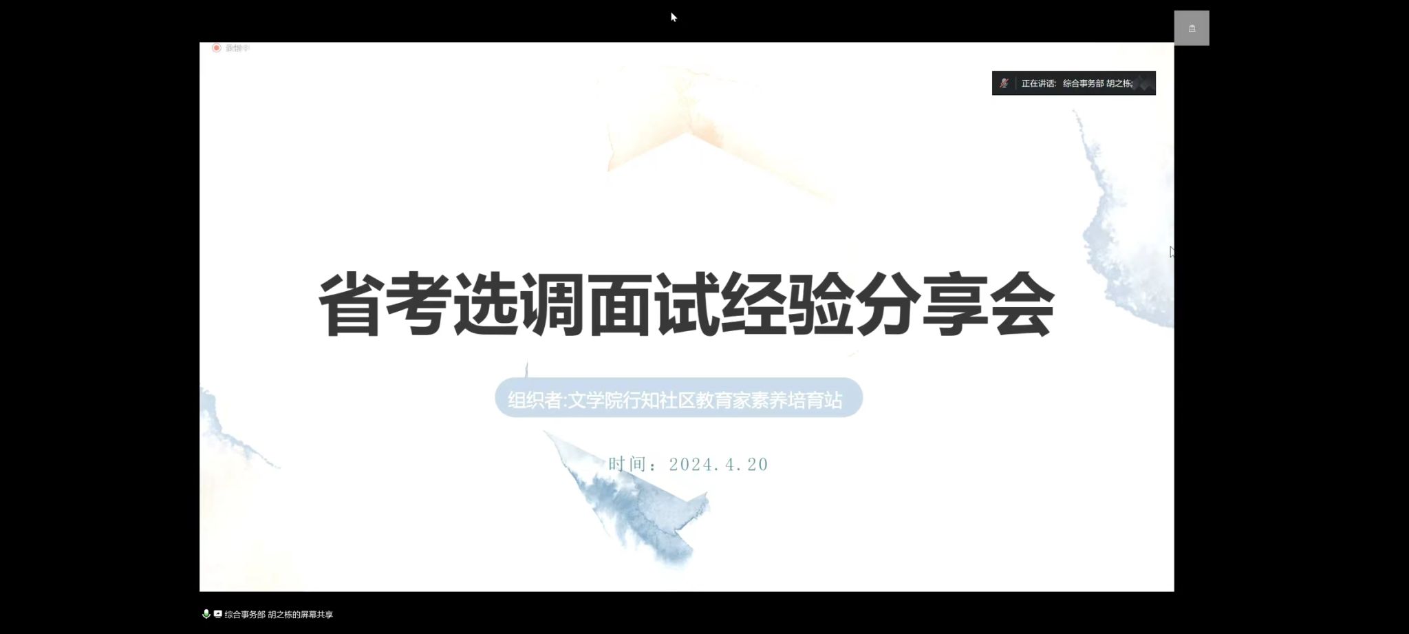4月20日下午,bg大游官方网站省考选调面试经验线上分享会成功举办,本次活动特邀杨帆、强炜杉、董徐慧三位优秀毕业生进行省考选调面试经验分享,共计200名同学参加。