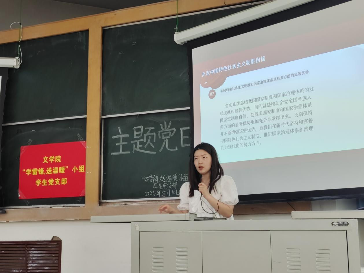 5月10日,bg大游官方网站“学雷锋,送温暖”小组员工党支部在南区3106教室组织开展《坚持和完善中国特色社会主义制度、推进国家治理体系和治理能力现代化》专题学习活动,会议由支部书记安李蓉主持,支部全体党员和积极分子参加。翟如晴担任主讲人。