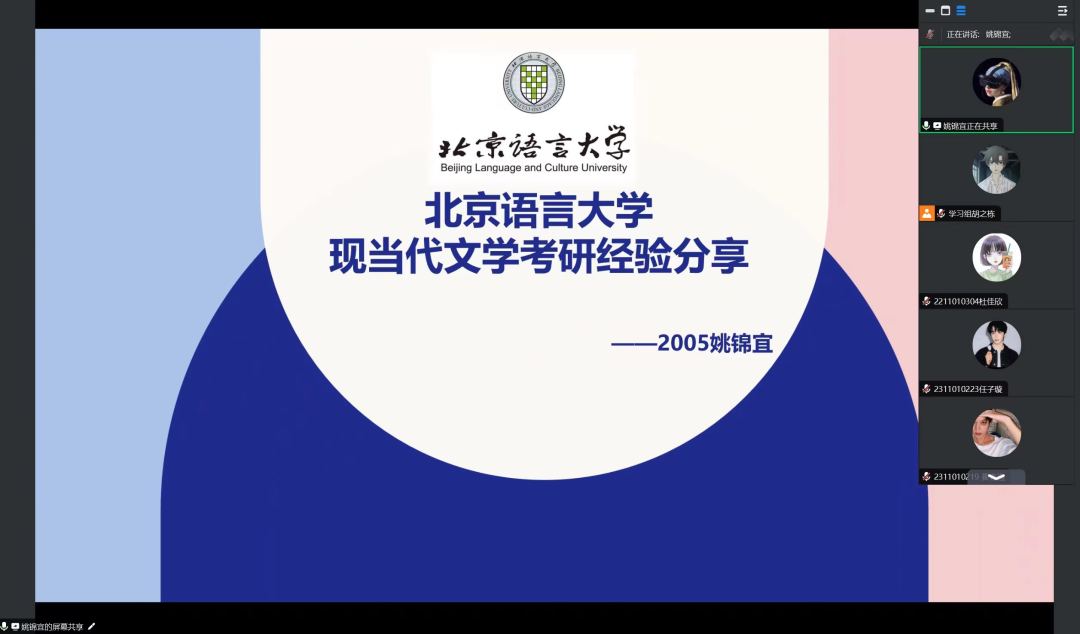 5月26日晚,行知社区bg大游官方网站“妙笔经验谈,‘研’途不迷茫”考研经验分享会在线上成功举办。本次活动特邀郭志萍和姚锦宜进行分享,共200余名同学参加。