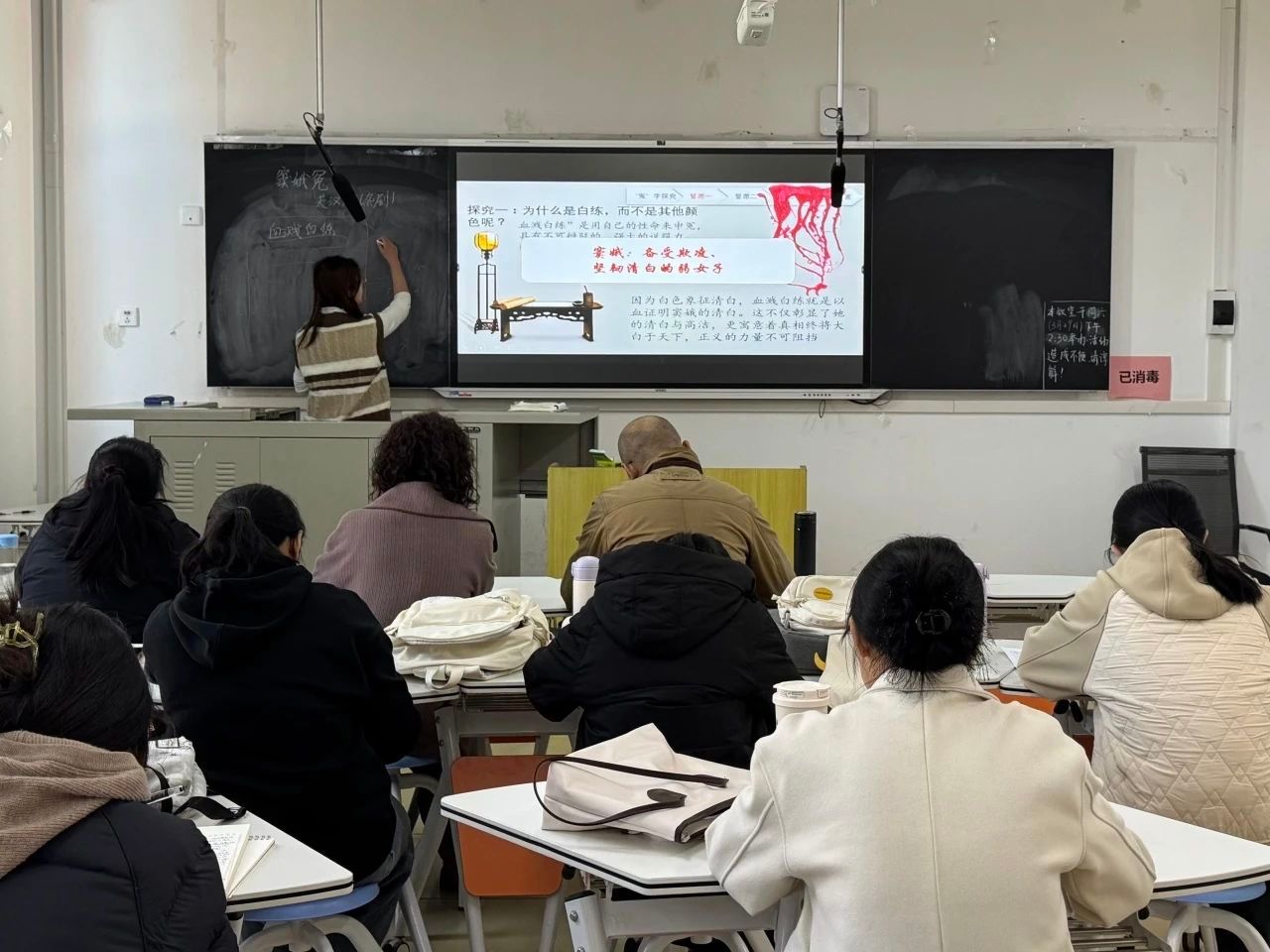 活动开场,同学们聚焦备课环节,阐述了教学目标的设定思路以及教学任务的整体规划,展现出扎实的教学准备功底。在随后的教学展示中,同学们对不同体裁课文进行了精彩讲解。古典诗词解读时,同学们或以“相逢”为切入点,带领大家穿越时空,深入剖析《琵琶行并序》中人物间的灵魂交流;或将《劝学》置于现代教育视角下,巧用思维导图梳理文章逻辑,让古老的劝学智慧在创新教学方法中重焕生机。在小说赏析板块,同学们或紧扣《林教头风雪山神庙》中“火”与“风雪”两大意象,揭示其推动情节、塑造人物和深化主旨的关键作用;或通过融入“淇水”意象的板书,复盘《氓》中女主人公的心路历程,引导大家反思爱情的本质。此外,同学们还从说文解字的角度,结合六月飞雪情节,重塑《窦娥冤》中窦娥的形象。